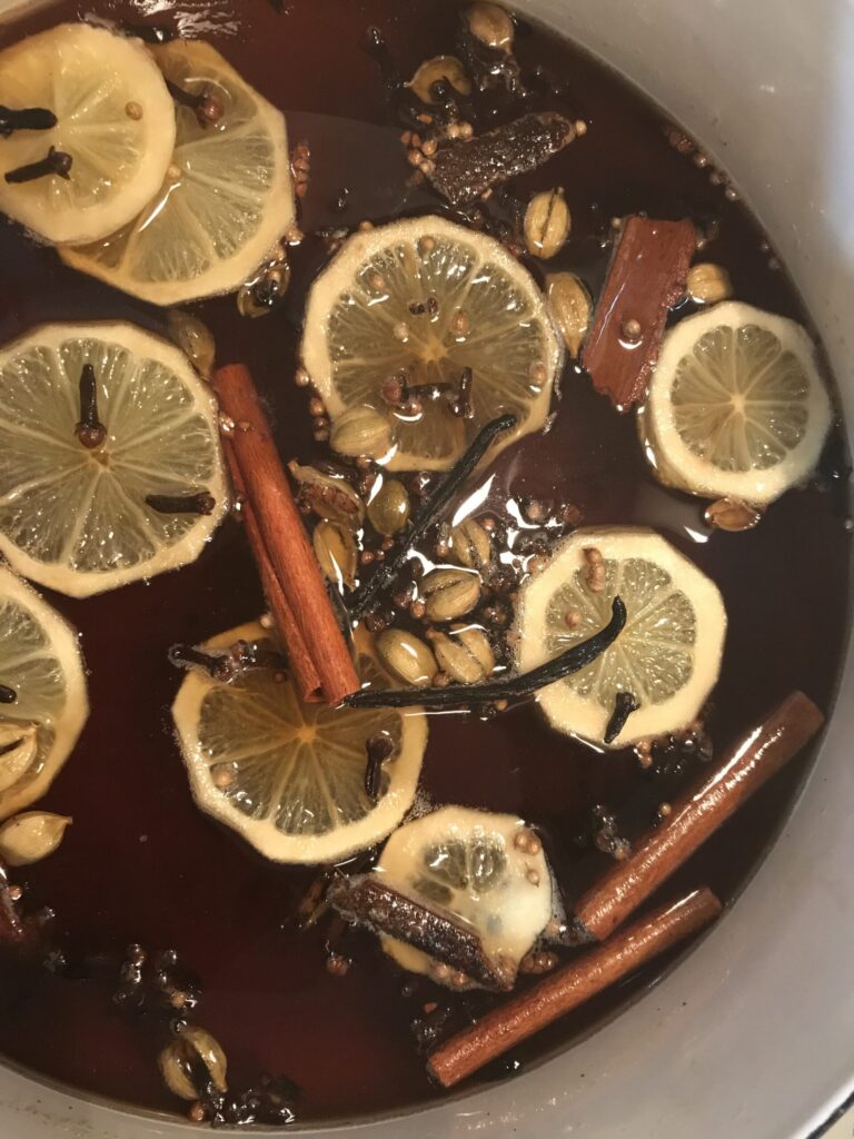 ③水分がたっぷり出たら、お好みのスパイス(シナモン、クローブ、八角、カルダモン、フェンネルシード、五香粉など)を入れ火にかける お好みで唐辛子1本も入れる